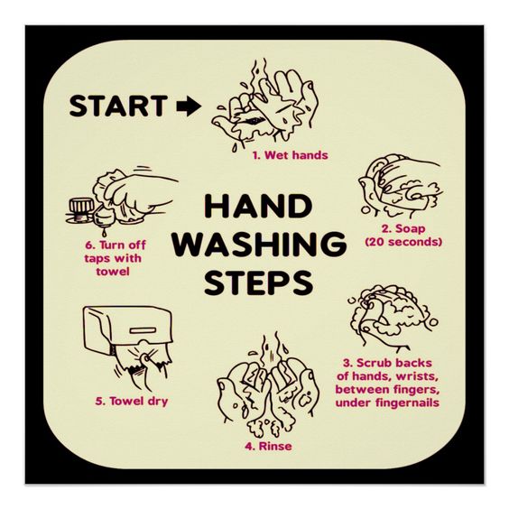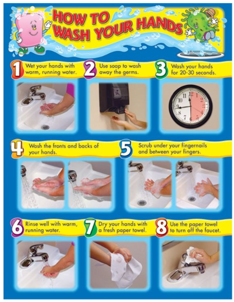 This third example is a different take on the handwashing routine. It organizes the steps of handwashing in a cycle rather than a linear grid. This emphasizes the continual nature of hand washing, which is important for keeping hands clean throughout the day. The cycle would have been better served if the designers used the Gestalt principle of connectedness by including arrows between the steps. This would have emphasized the process of the poster. However, the steps are numbered and the start of the process is labeled, so the audience can still grasp the order of the steps. The designers of the poster could have perhaps put the numbering of the step at a different level fro the caption text, by making the numbers a larger or different font size. This might have made the ordering of the steps more apparent. Because of the different format of the poster the grid is different from that of the first two. The grid could possibly radial rather than a standard square grid.