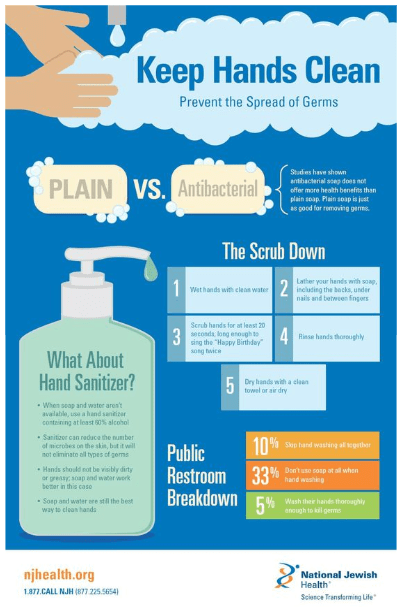 This last poster chose to use a different format. It is more in the style of a traditional infographic by including multiple different types of information, such as of hand sanitizer and public restrooms. The actual steps of the handwashing process are included under the heading of “The Scrub Down”. There is no accompanying images with the steps of washing, which is always helpful in the explanation of a process, as seen in the other posters. The text of the steps are clear, so they communicate the process well, but the picture still would have been helpful. The grid of the poster seems to be similar to that of the first two posters, a square grid with small modules. The poster emphasizes the proximity principle by clearly sectioning off different groups of information within the poster. The text of the poster is quite small, and this decreases the legibility and readability of the poster.