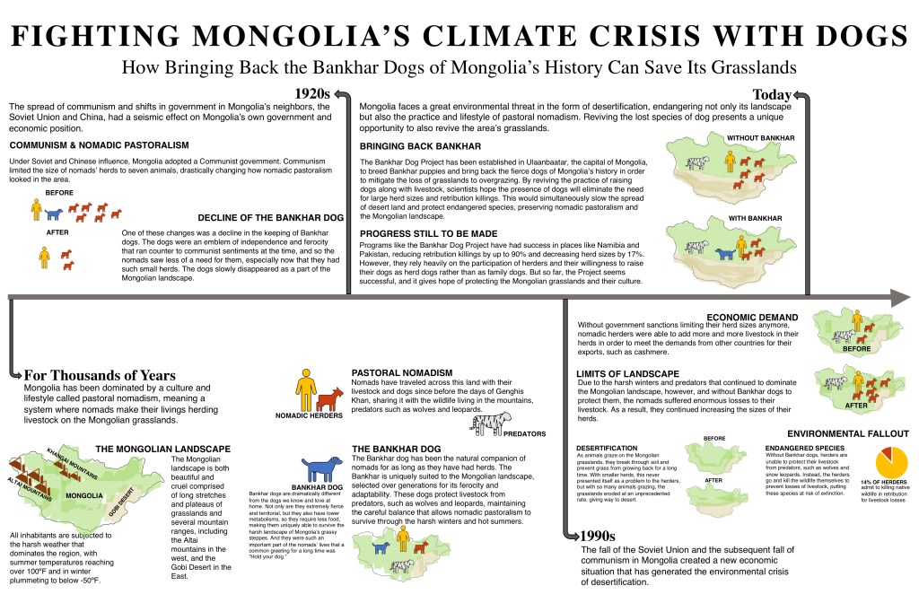 I received a recommendation for my first draft to create a graph of desertification, because the way I was representing it visually at the time was not effective. However, I also received feedback that wanted to know the distribution of grasslands vs. desert across Mongolia, and I thought that was more fitting as a way of illustrating the spread of desertification, so I implemented greater use of color, and attempted a more realistic depiction of Mongolia’s geography as a way of getting across what I needed to.